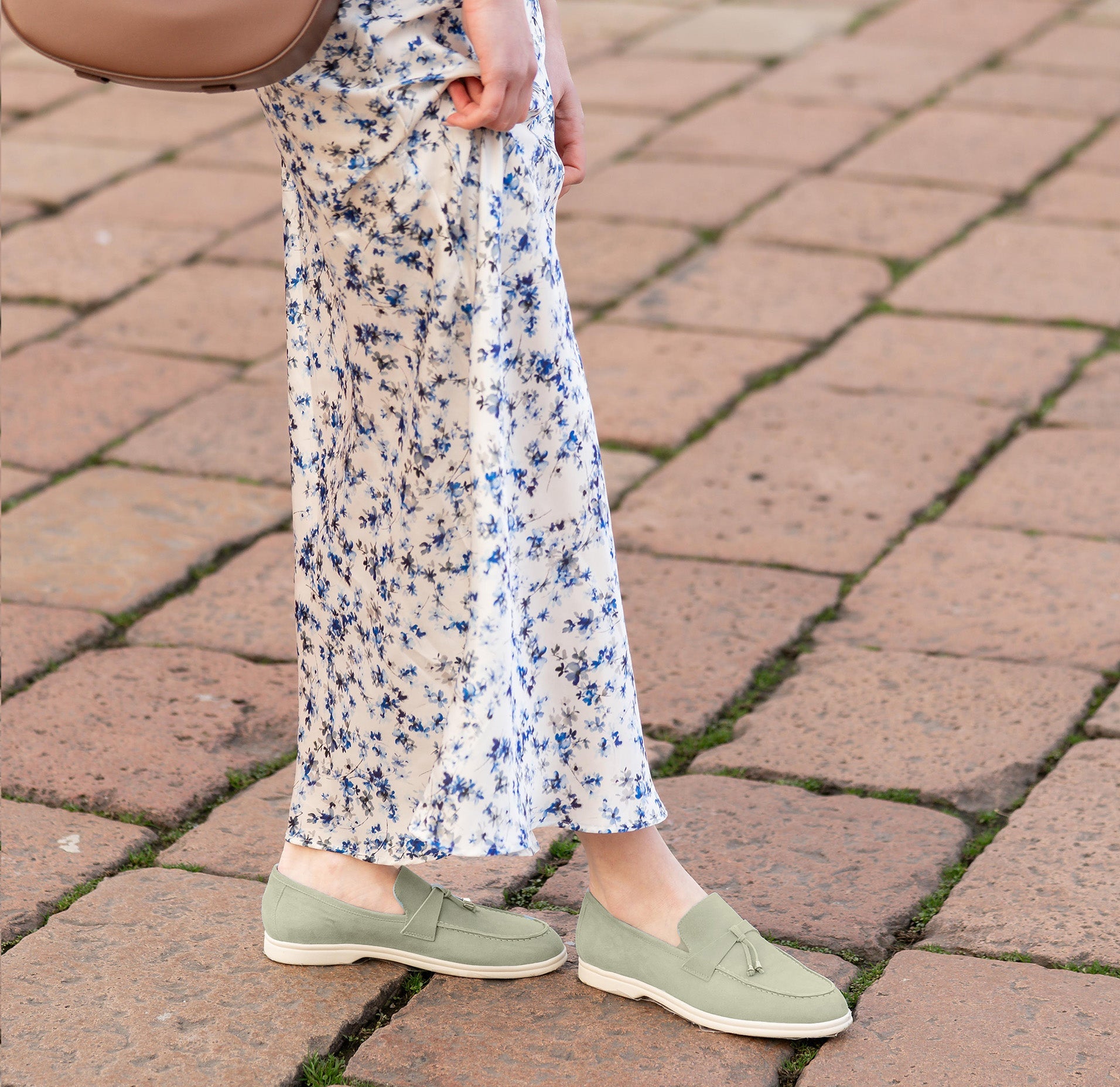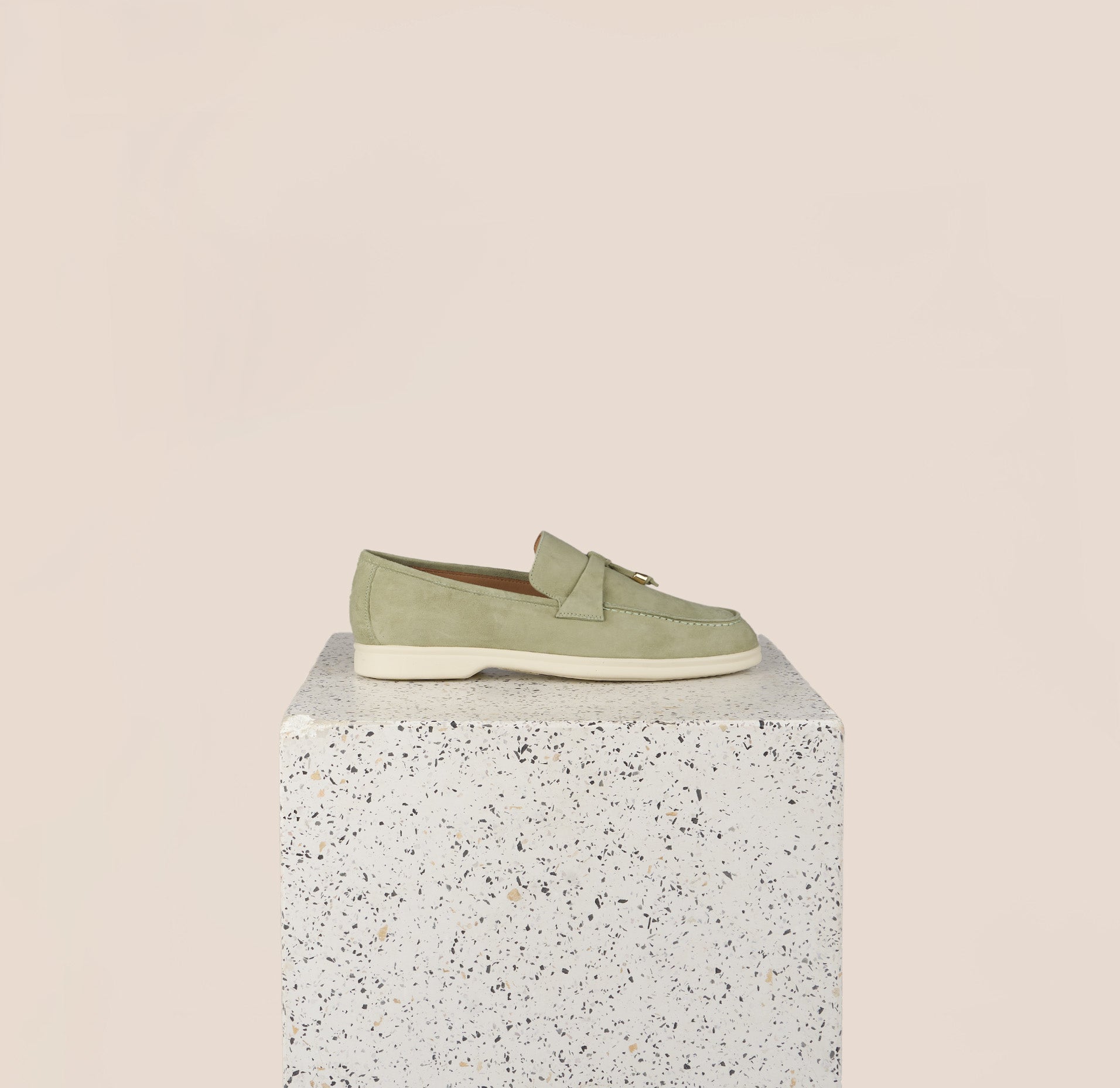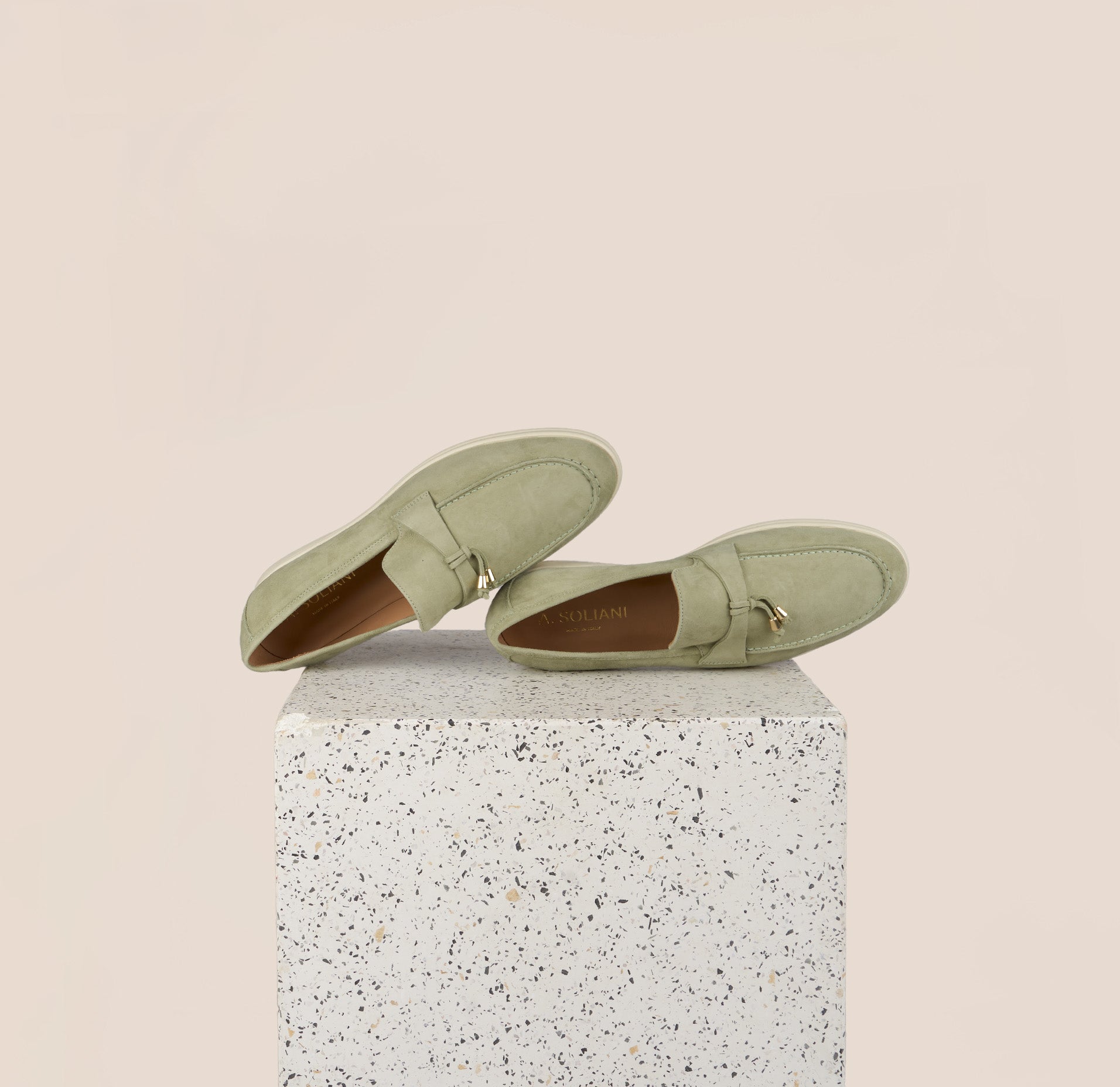 Expert craftsmen in Italy have carefully crafted the 'Lisa' loafer to be a lightweight and comfortable shoe with a casual-chic design that is ideal for all year round. The shoe boasts a high-quality and flexible rubber sole, an enveloping upper for added comfort, and an understated elegance that sets it apart. Additionally, the shoe is made with olive suede leather, features hand-stitched details on the sides of the vamp, and has a reinforced heel.