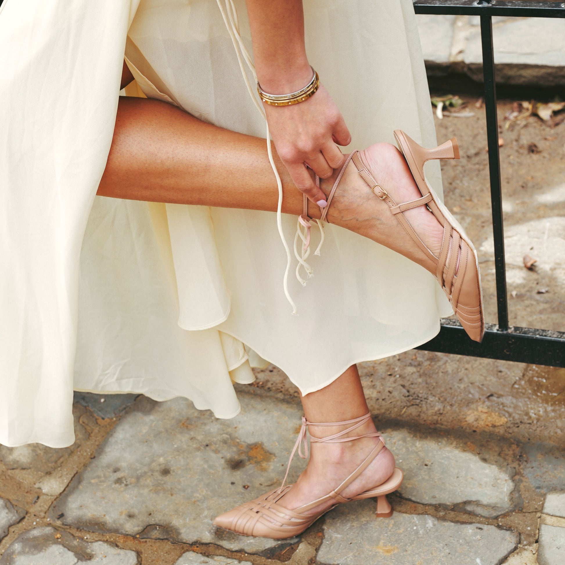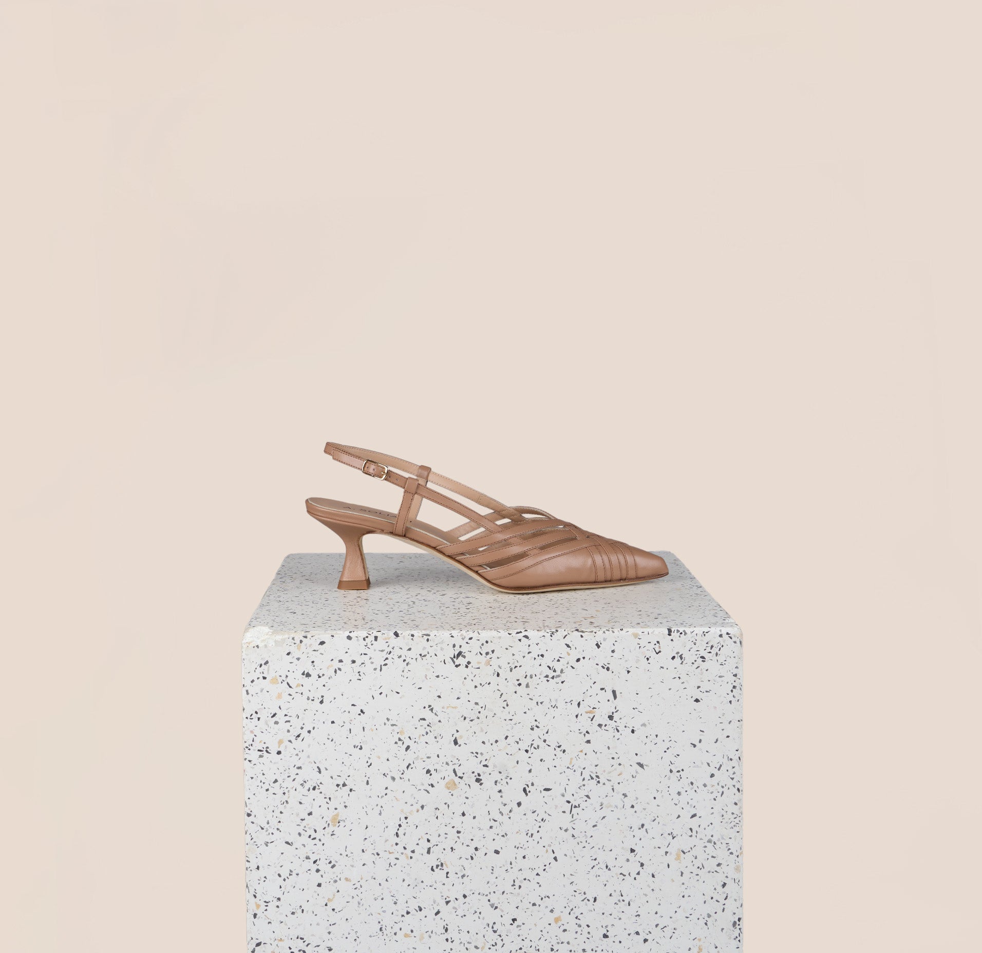 Our Novara in a refined nude shade is the perfect choice for those seeking both elegance and comfort in a single shoe. The slingback design with an adjustable strap gently embraces the foot, ensuring a secure yet effortless fit. An intricate woven detail on the pointed toe adds a distinctive touch of sophistication, while the medium, sculpted heel offers both stability and femininity. Whether for office wear or special occasions, the Novara seamlessly blends style and versatility.