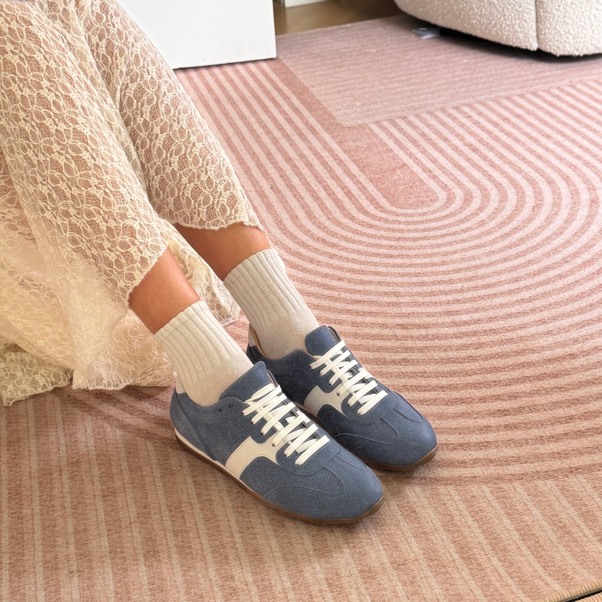 The Puglia Denim pairs a soft denim-blue leather with crisp white leather accents, adding a versatile and effortlessly chic edge to this contemporary shape.