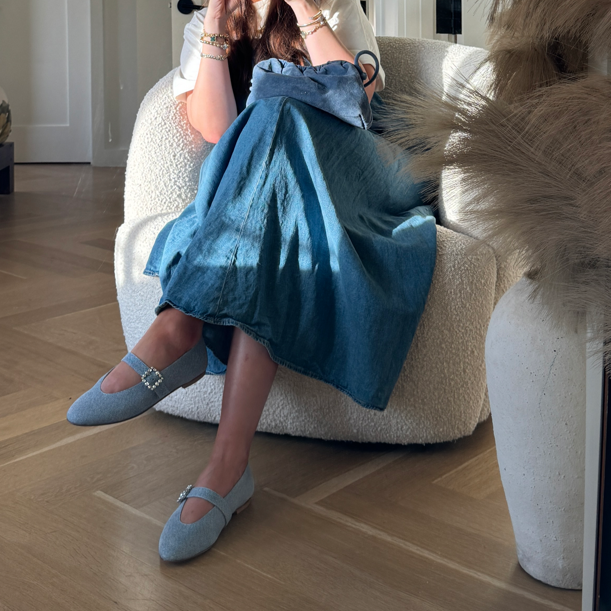 The Scala Buckle flats are available in a unique printed suede that resembles denim. This innovative material combines the softness and flexibility of suede with a stylish denim-like pattern, offering a modern and casual twist to classic suede.